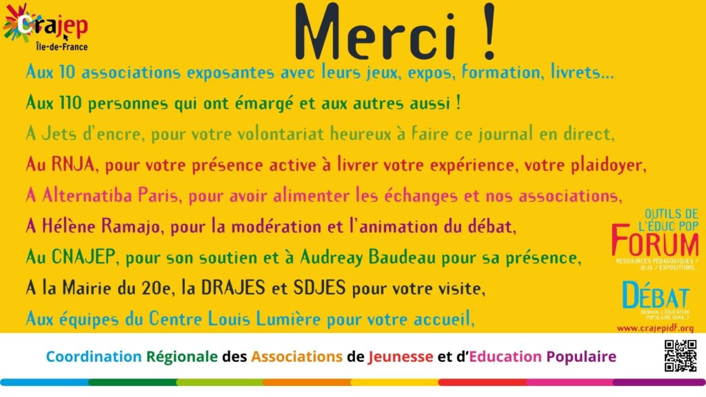 La CRAJEP organisait une journée de rencontre ouverte aux professionnel·les de l’animation, acteurs associatifs, bénévoles et militant·es. En toute modestie, ce fut un véritable succès ! On nous souffle que c’était une riche et joyeuse journée de coopération inter-réseaux dédiée à l’éducation populaire.